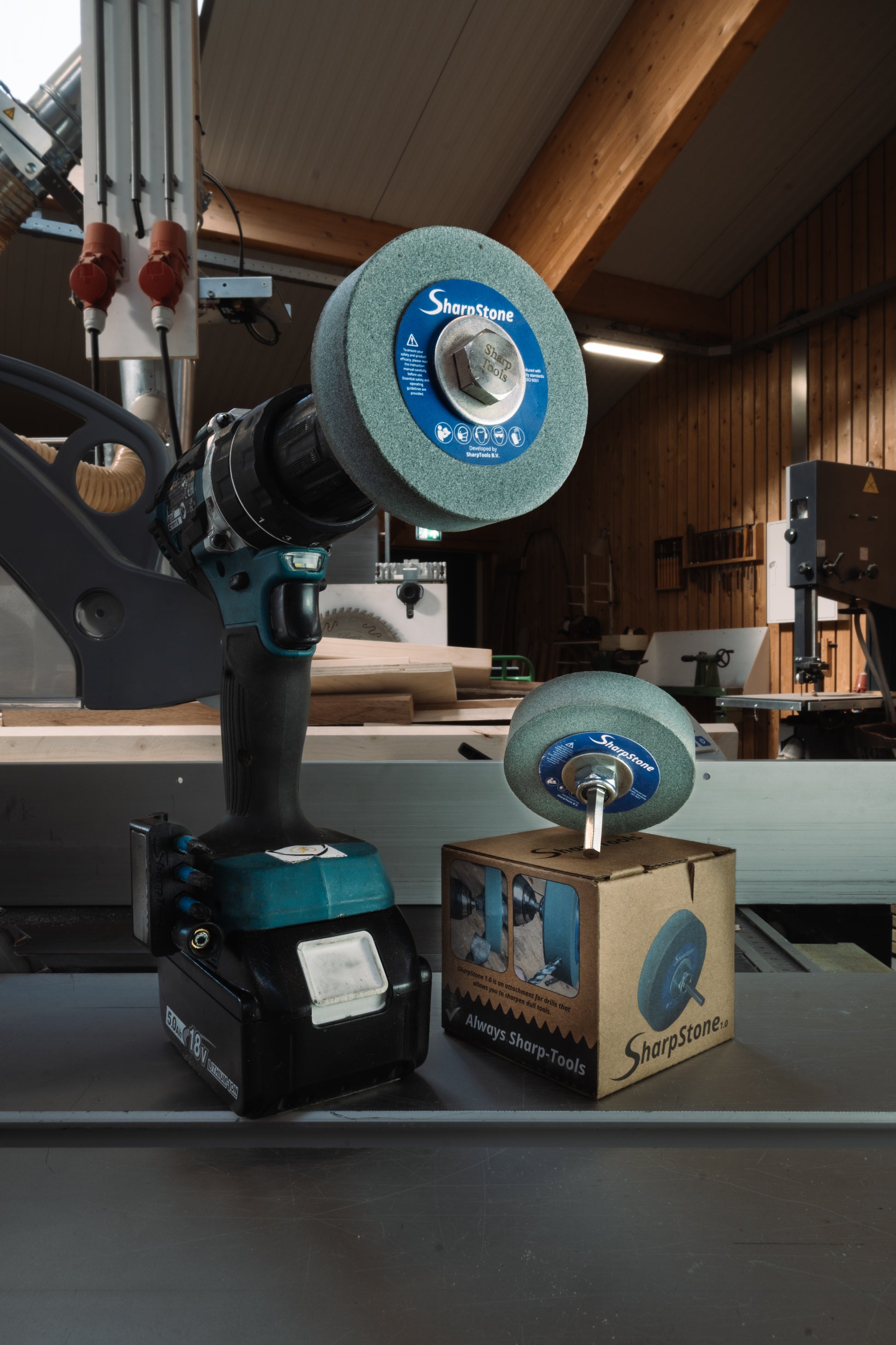 A compact sharpener powered by your (cordless) drill — ready to use anywhere.